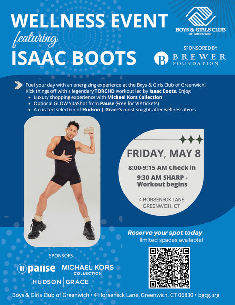 Join Boys & Girls Club for fresh, wellness-inspired beverages, optional GLOW VitaShot from Pause Greenwich, and a legendary workout with Isaac Boots TORCH'D. Shopping opportunities and VIP gift bags also available.